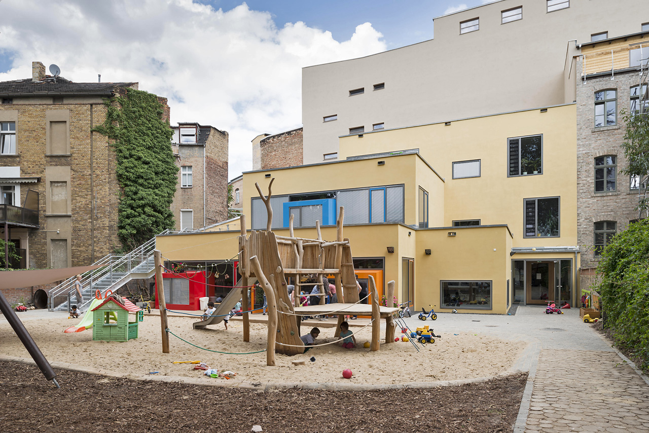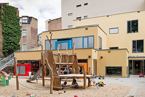 In zweiter Linie soll der Neubau in zurückhaltender Sachlichkeit unprätentiös ohne gestalterische und symbolische Überhöhung den ideellen Anspruch an Funktion und Ästhetik einer Kindertagesstätte nach innen und außen präsentieren.