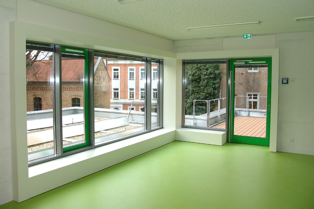 Die Schnittstelle von Neubau und Baukörpervolumen des angrenzenden Altbaus wird thematisiert. Folgerichtig wird an dieser Stelle der Haupteingang und das Erschließungstreppenhaus, gleichzeitig 1. Rettungsweg, und unmittelbar daran anschließend der Personenaufzug platziert. Es entstand eine angemessene behindertengerechte Erschließungszone. Das Gebäude ermöglicht aufgrund seiner terrassierten Ausprägung vielfältige Durchblicke und Ausblicke und eröffnet interessante Blickbeziehungen im Gebäude selbst und in den einströmenden Freiraum.