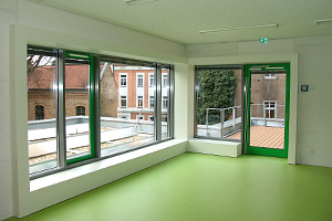 Jeder Gruppenraum der Geschosse kann über einen direkten Ausgang ins Freie verlassen werden. Die beiden oberen Geschosse werden über begehbare Terrassen und eine Außentreppenanlage als 2. Rettungsweg oder über das notwendige Treppenhaus als 1. Rettungsweg evakuiert.