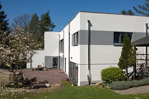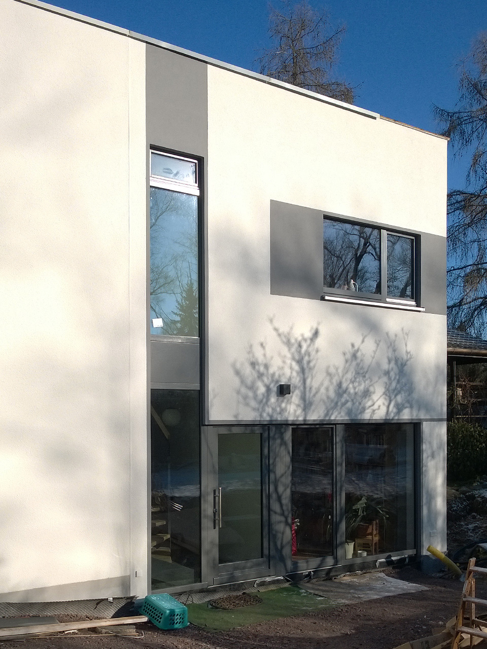 Als Teil des südlichen Wohngebietes Kröllwitz wurde das Wohnhaus als freistehendes Einfamilienhaus 1983/84 erbaut. Das Gebäude wurde auf der Basis des Eigenheimtyps Haus „Liliental“ -R- des Institutes für Stahlbau entwickelt und für den damaligen Bauherrn angepasst. Die neue Mehrgenerationen-Nutzung bezieht mit dem Ausbau des ehemaligen Keller- und Garagengeschosses sowohl die Großeltern, die es erbauen ließen, als auch die Eltern und Kinder der Familie konzeptionell ein. Der neu entstehende 2-geschossige seitliche Anbau fügt sich durch eine einheitliche Fassadengestaltung mit gleicher Attikahöhe harmonisch an das modernisierte Bestandsgebäude und gestattet eine getrennte Erschließung der überlagerten Wohneinheiten.